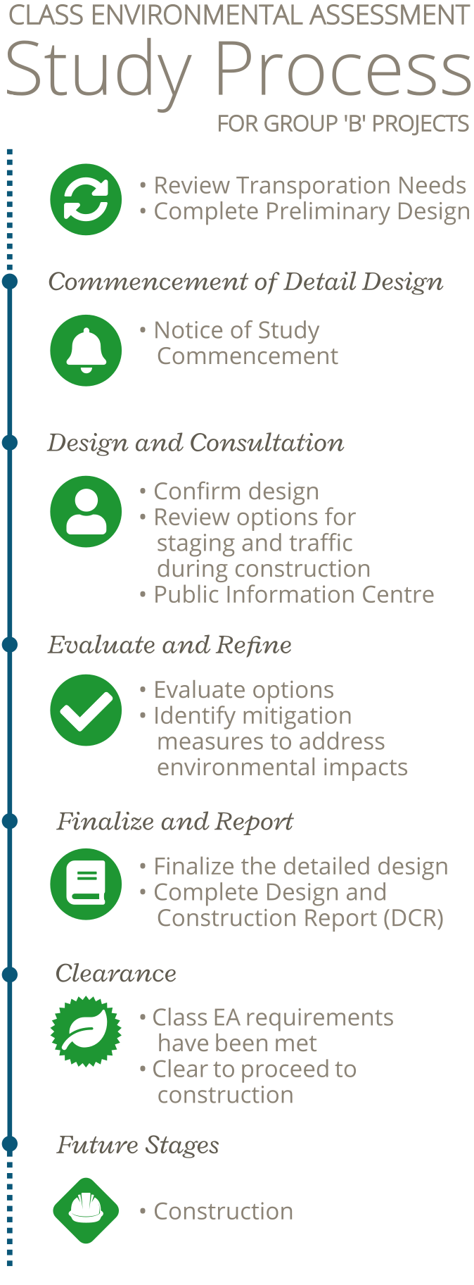 A Design and Construction Report (DCR) fulfills the documentation requirements of the Class EA process for a Group ‘B’ project. The DCR will be made available for a 30-day public review period at the end of the Detail Design study. A public notice advising of the start of the review period will be provided.